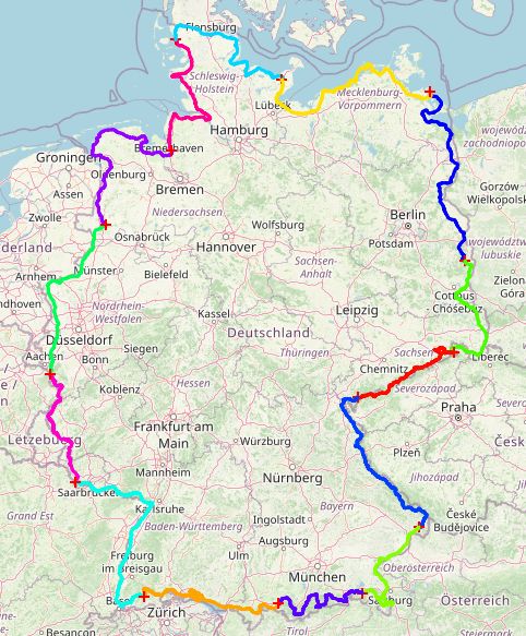Hier werden Deutschlands Bundesländer angezeigt. Bis auf Ausnahmen verläuft die gesamte Tour sehr nah an den Grenzen der benachbarten Länder bzw. Ost- und Nordsee.